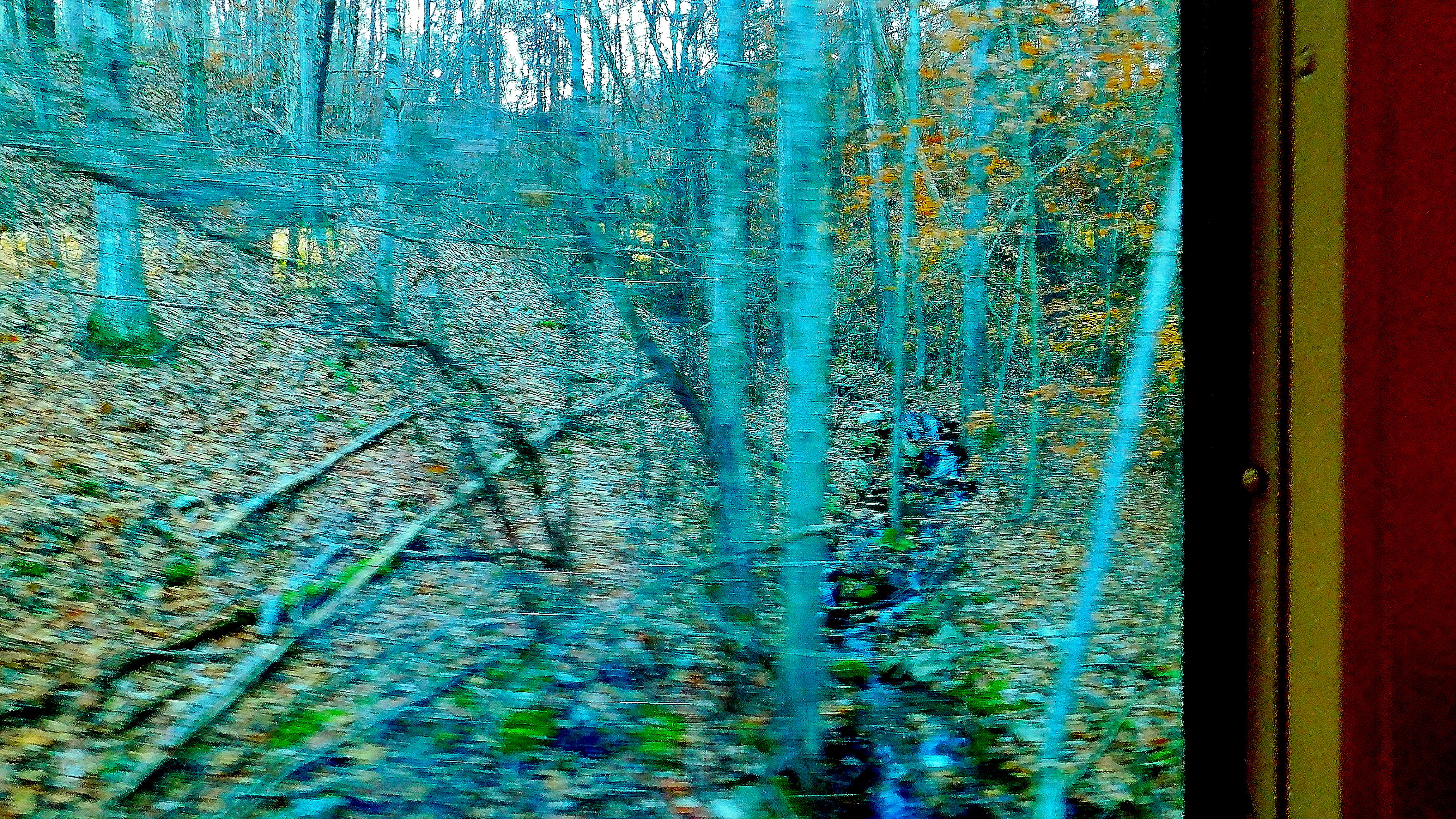 An iconic photo of train tracks leading into the woods. A late autumn train ticket for a train ride along the Lackawaxen River from Hawley to Lackawaxen, Pa and back. Choo Choo